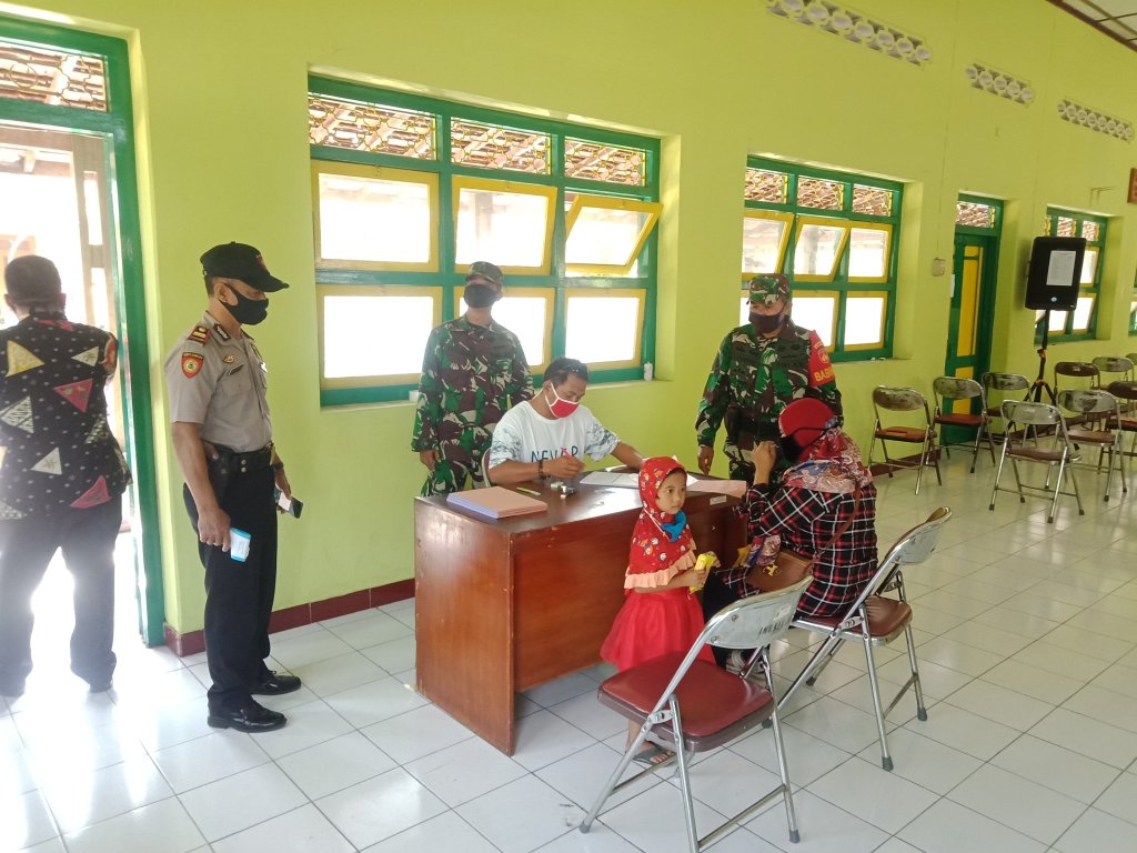 Klaten—Koramil 21/Juwiring bersama Polsek Juwiring dan Security BNI 46 Delanggu melakukan pengamanan kegiatan pendistribusian dan pembagian Kartu Keluarga Sejahtera (KKS) kepada Keluarga Penerima Manfaat (KPM) oleh BNI 46 Delanggu, di Aula Kantor Kecamatan Juwiring, Kab. Klaten, Jumat (15/05/20),