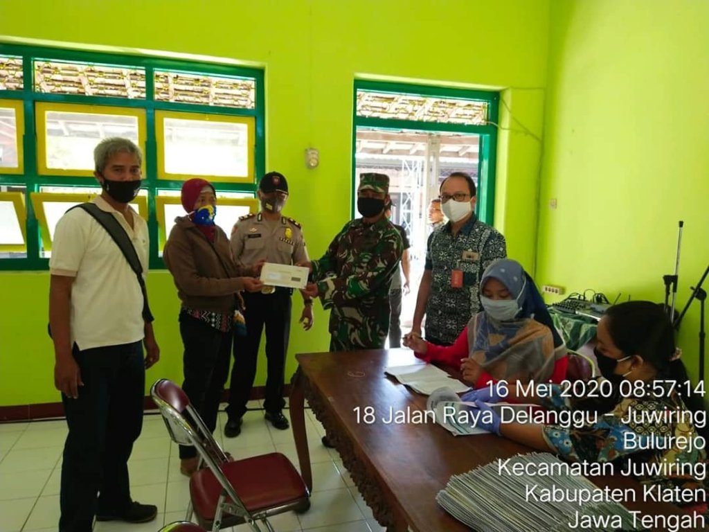 Klaten—Koramil 21/Juwiring bersama Polsek Juwiring dan Security BNI 46 Delanggu melakukan pengamanan kegiatan pendistribusian dan pembagian Kartu Keluarga Sejahtera (KKS) kepada Keluarga Penerima Manfaat (KPM) oleh BNI 46 Delanggu, di Aula Kantor Kecamatan Juwiring, Kab. Klaten, Sabtu (16/05/20),