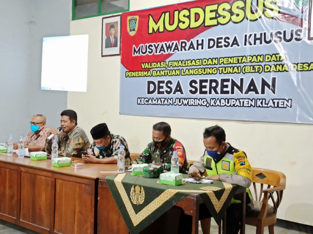 Sebelum BLT ditetapkan dan dicairkan, Pemerintah Desa Serenan mengadakan rapat koordinasi bersama Babinsa, Bhabinkamtibmas, BPD, dan Ketua RT/RW membahas tentang calon penerima bantuan dengan mempedomani empat belas kriteria dari Kemendes RI.