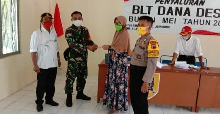 Klaten | Babinsa Desa Tanjung Koramil 21/Juwiring melaksanakan pengamanan kegiatan pembagian BLT (Bantuan Langsung Tunai) dari Dana Desa Tanjung TA. 2020 yang bertempat di Kantor Desa Tanjung, Kecamatan Juwiring, Kabupaten Klaten, Rabu (20/05/2020 ).
