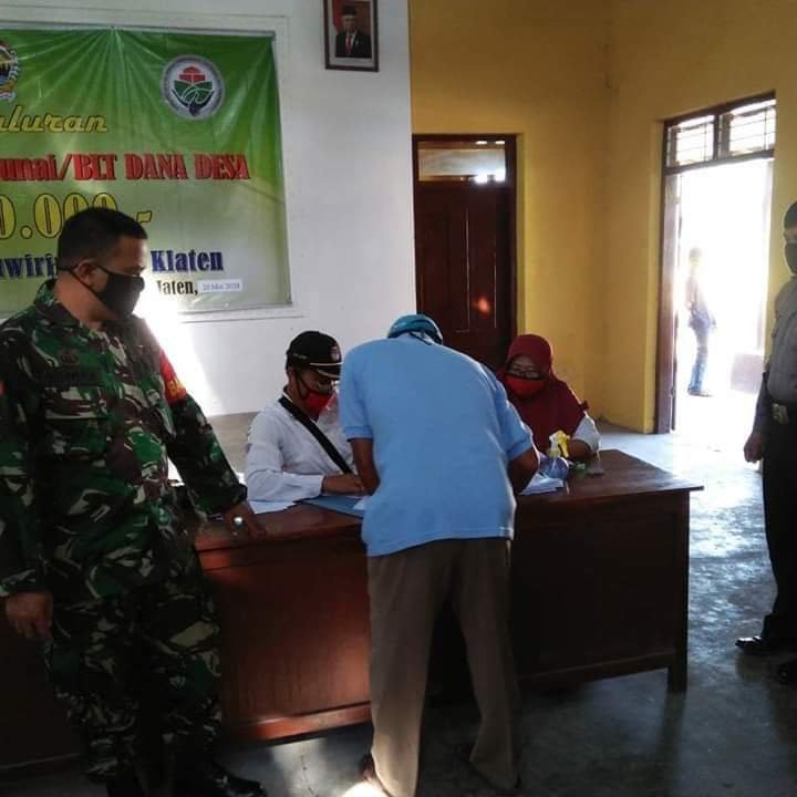 Klaten | Babinsa Desa Jaten Koramil 21/Juwiring melaksanakan pengamanan kegiatan pembagian BLT (Bantuan Langsung Tunai) dari Dana Desa Jaten TA. 2020 yang bertempat di Kantor Desa Jaten, Kecamatan Juwiring, Kabupaten Klaten, Rabu (20/05/2020 ).