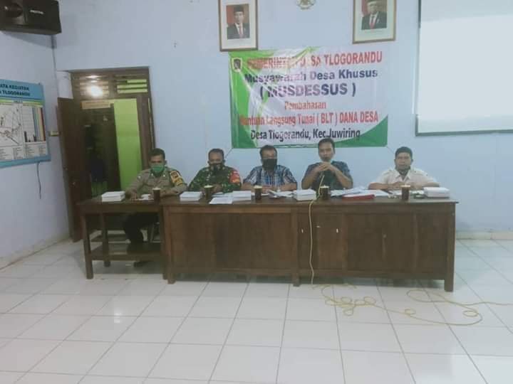 “Keluarga kurang mampu yang terdampak pandemi Covid-19 di Desa Tlogorandu Kec. Juwiring sejumlah 152 KK akan mendapatkan bantuan langsung yang bersumber dari Dana Desa tahun 2020” ungkap Serka Dwi Paryono.