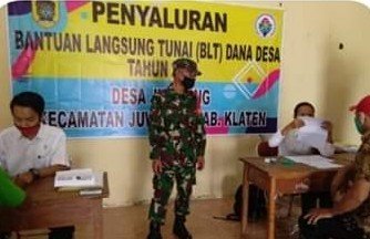 Klaten | Babinsa Desa Juwiring Koramil 21/Juwiring melaksanakan pengamanan kegiatan pembagian BLT (Bantuan Langsung Tunai) dari Dana Desa Juwiring TA. 2020 yang bertempat di Kantor Desa Juwiring, Kecamatan Juwiring, Kabupaten Klaten, Rabu (20/05/2020 ).