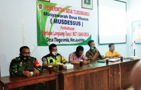 “Keluarga kurang mampu yang terdampak pandemi Covid-19 di Desa Tlogorandu Kec. Juwiring sejumlah 140 KK akan mendapatkan bantuan langsung yang bersumber dari Dana Desa tahun 2020” ungkap Serka Dwi Paryono.