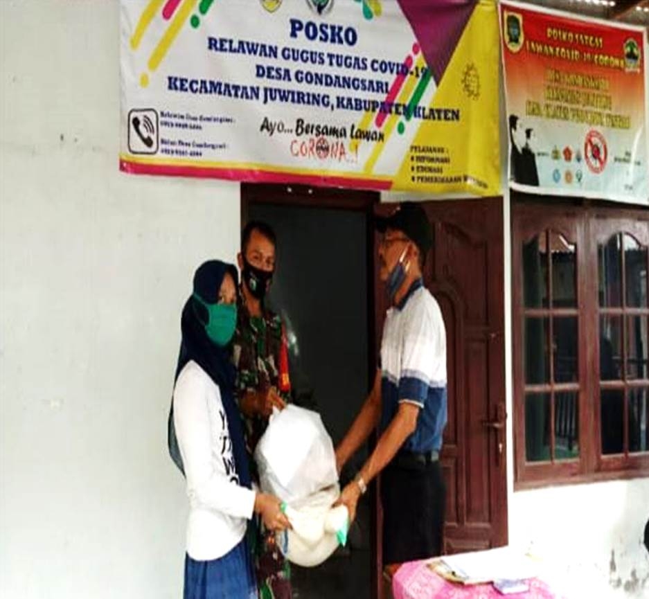 Klaten | Babinsa Desa Gondangsari Koramil 21/Juwiring Kodim 0723/Klaten Serka Wahyono ikut mendampingi penyaluran Bantuan Sosial dari Pemerintah Propinsi Jateng kepada warga kurang mampu yang terdampak pandemi covid-19, di wilayah Desa Gondangsari, Kecamatan Juwiring, Kab. Klaten, Jumat (19/06/20).