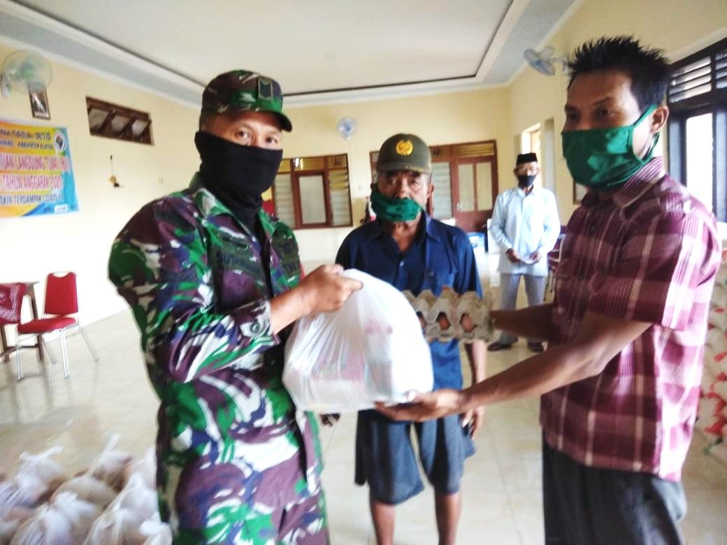 Klaten | Babinsa Desa Jetis Koramil 21/Juwiring Kodim 0723/Klaten Serma Sutarman ikut mendampingi penyaluran Bantuan Sosial dari Pemerintah Propinsi Jateng kepada warga kurang mampu yang terdampak pandemi covid-19, di wilayah Desa Jetis, Kecamatan Juwiring, Kab. Klaten, Jumat (19/06/20).
