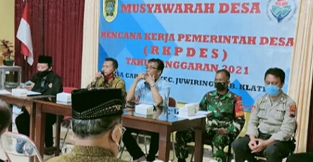 Klaten | Serda Agung Babinsa Desa Carikan Koramil 21/Juwiring Kodim 0723/Klaten menghadiri acara Musdes pembahasan penyusunan Rencana Kerja Pemerintah Desa (RKPDes) Tahun Anggaran 2021 Desa Carikan, bertempat di Aula Kantor Desa Carikan, Kec. Juwiring, Kab. Klaten, Jumat (20/6/2020).