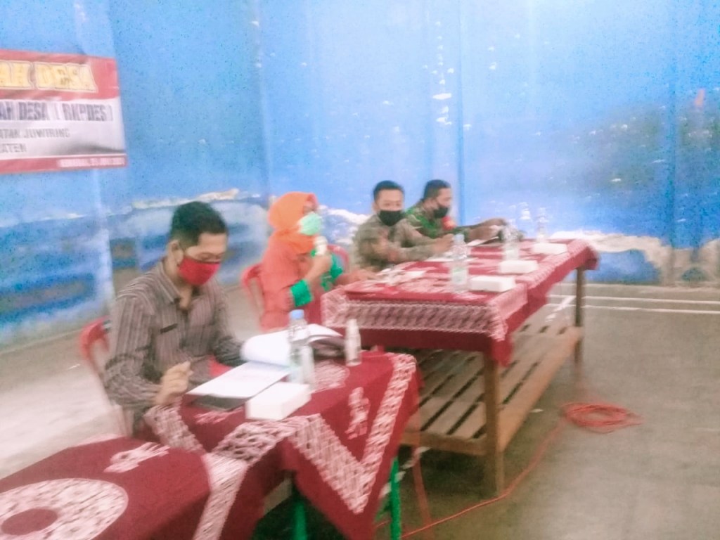 Klaten | Babinsa Desa Kenaiban Koramil 21/Juwiring Kodim 0723/Klaten Serka Sugimin menghadiri acara Musdes pembahasan penyusunan Rencana Kerja Pemerintah Desa (RKPDes) Tahun Anggaran 2021 Desa Kenaiban, bertempat di Aula Kantor Desa Kenaiban, Kec. Juwiring, Kab. Klaten, Kamis (25/6/2020) malam.