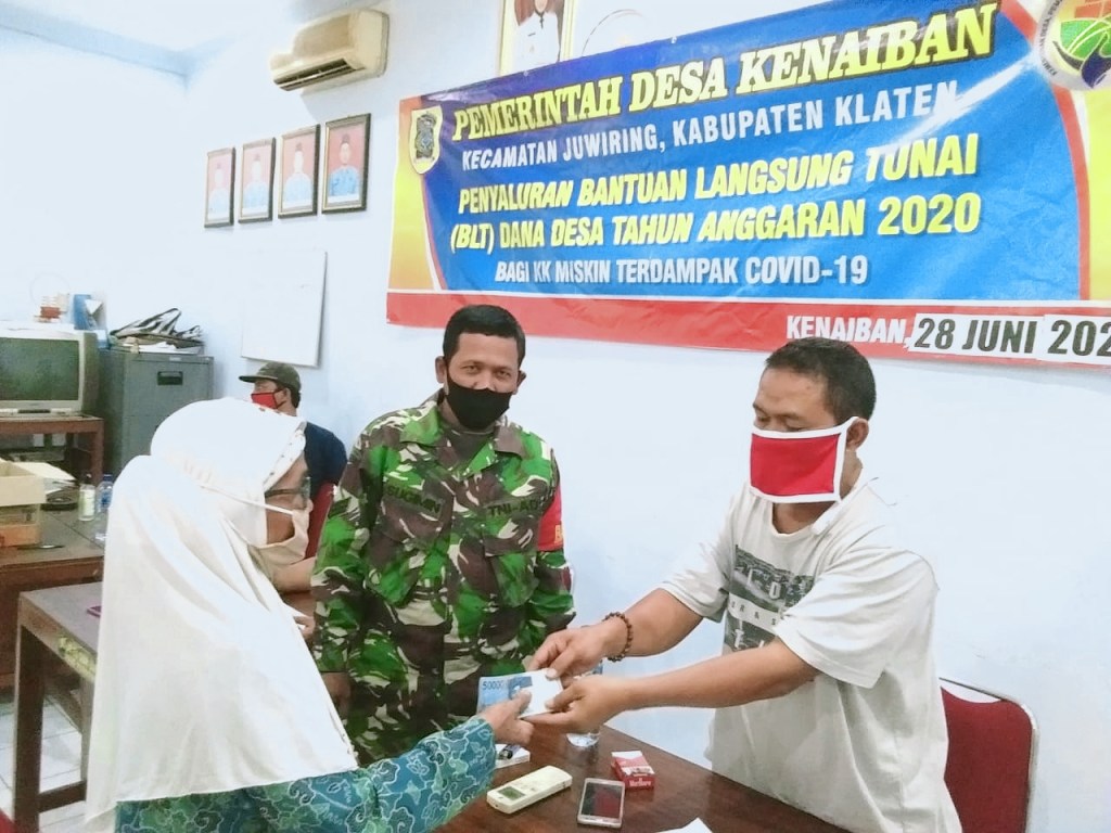 Klaten | Babinsa Desa Kenaiban Koramil 21/Juwiring Kodim 0723/Klaten Serka Sugimin melaksanakan pengamanan kegiatan pembagian BLT (Bantuan Langsung Tunai) Tahap ll dari Dana Desa Kenaiban TA. 2020 yang bertempat di Kantor Desa Kenaiban, Kecamatan Juwiring, Kabupaten Klaten, Minggu (28/06/2020 ).