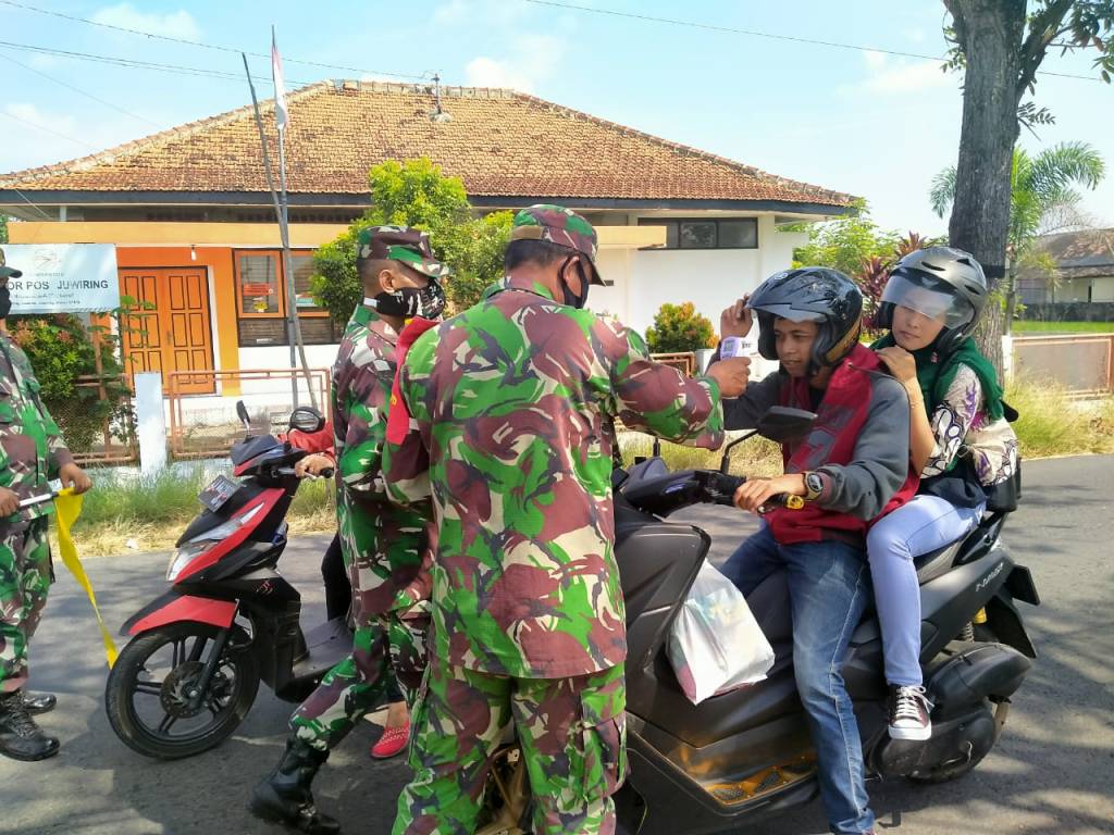 Klaten | Koramil 21 Juwiring bersama Polsek Juwiring dan Kasi Trantib Kecamatan Juwiring melakukan Kegiatan Sosialisasi Penegakan Penerapan New Normal sekaligus Sosialisasi Penindakan yang akan dilakukan Aparat Penegak Hukum bagi pelanggar protokol kesehatan, Selasa (14/07/2020).