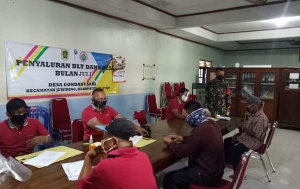 Klaten | Babinsa Desa Gondangsari Koramil 21/Juwiring Kodim 0723/Klaten Serka Wahyono melaksanakan pengamanan kegiatan pembagian BLT (Bantuan Langsung Tunai) Tahap lll dari Dana Desa Gondangsari TA. 2020 yang bertempat di Kantor Desa Gondangsari, Kecamatan Juwiring, Kabupaten Klaten, Jumat (24/07/2020 ).