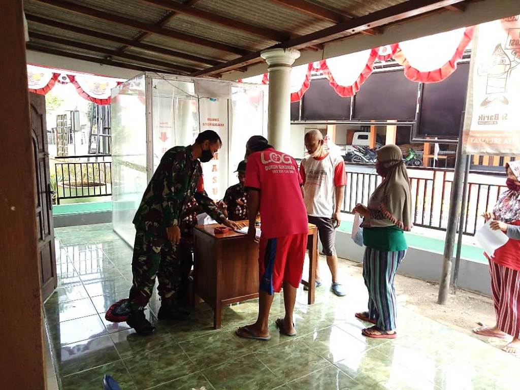 Klaten | Babinsa Desa Gondangsari Koramil 21/Juwiring Kodim 0723/Klaten Serka Wahyono ikut mendampingi penyaluran Bantuan Sosial dari Pemerintah Provinsi Jateng kepada warga kurang mampu yang terdampak pandemi covid-19, di wilayah Desa Gondangsari, Kecamatan Juwiring, Kab. Klaten, untuk memastikan agar bantuan tersebut tepat sasaran dan sampai kepada yang berhak menerimanya, Selasa (11/08/20).