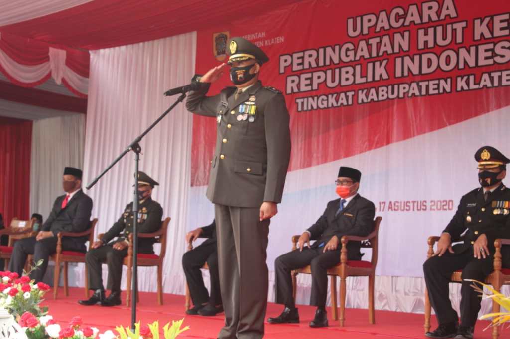 Klaten | Kepala Staf Komando Distrik Militer (Kasdim) Mayor Inf Ustadi Rahmad menjadi Irup saat upacara penurunan bendera merah putih dalam rangka HUT ke 75 Republik Indonesia di halaman Pendopo Bupati Klaten. Senin (17/08/20).