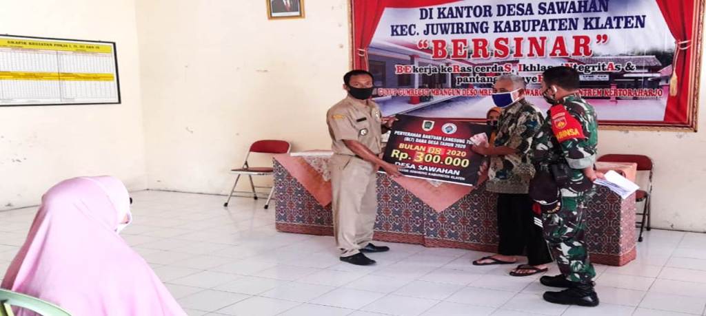 Klaten | Babinsa Desa Sawahan Koramil 21/Juwiring Kodim 0723/Klaten Serma Lamiyo melaksanakan pengamanan pembagian BLT (Bantuan Langsung Tunai) Tahap IV dari Dana Desa Sawahan TA. 2020 yang bertempat di Kantor Desa Sawahan, Kecamatan Juwiring, Kabupaten Klaten, Senin (31/08/2020 ).