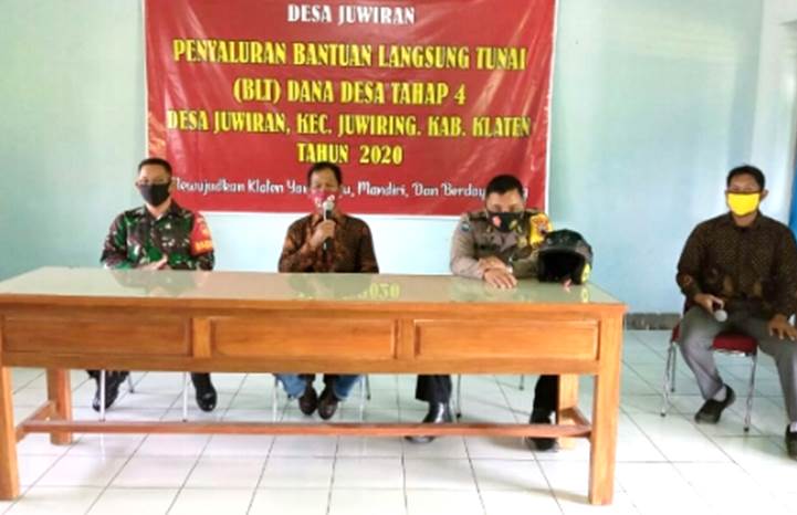 Klaten | Babinsa Desa Juwiran Koramil 21/Juwiring Kodim 0723/Klaten Serda Tridoyo melaksanakan pengamanan kegiatan pembagian BLT (Bantuan Langsung Tunai) Tahap IV dari Dana Desa Juwiran TA. 2020 yang bertempat di Kantor Desa Juwiran, Kecamatan Juwiring, Kabupaten Klaten, Selasa (1/9/2020).