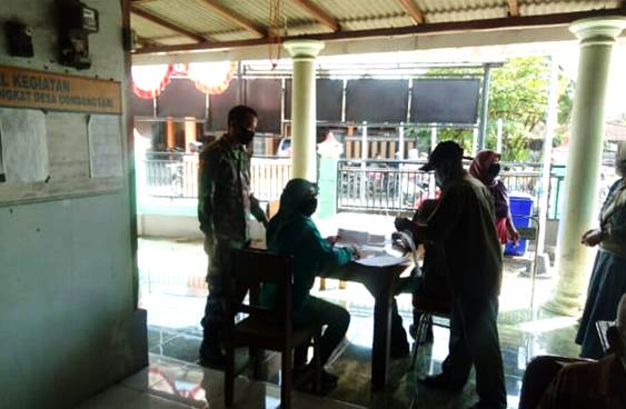 Klaten | Babinsa Desa Gondangsari Koramil 21/Juwiring Kodim 0723/Klaten Serka Wahyono melaksanakan pengamanan kegiatan pembagian BLT (Bantuan Langsung Tunai) Tahap IV dari Dana Desa Gondangsari TA. 2020 yang bertempat di Kantor Desa Gondangsari, Kecamatan Juwiring, Kabupaten Klaten, Jum’at (4/9/2020).