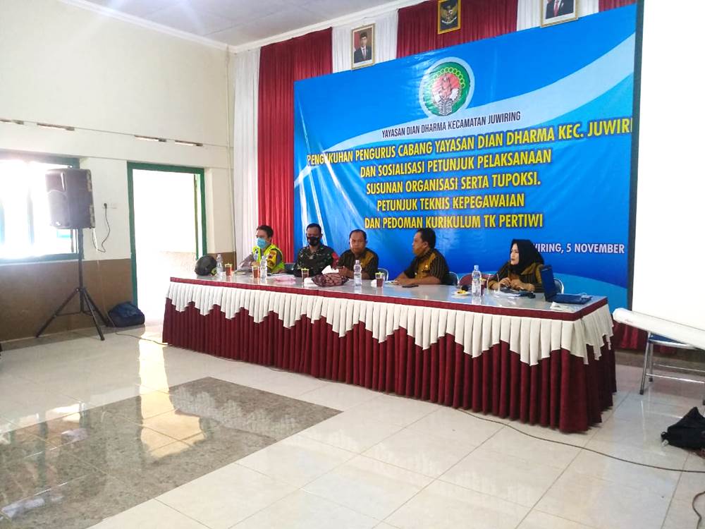 “ Oleh karena itu, kami berharap dengan dikukuhkannya Pengurus Yayasan Dian Dharma Kec. Juwiring ini, mampu peka dan memiliki solusi terhadap berbagai kondisi yang ada dewasa ini. Sehingga dapat memajukan pendidikan anak usia dini, seperti TK Pertiwi, yang selama ini selalu kalah bersaing dengan TK Swasta. Karena pemerintah telah menganggarkan dalam RAPBD Th. 2021 masih memprioritaskan untuk bidang pendidikan, “tambahnya.