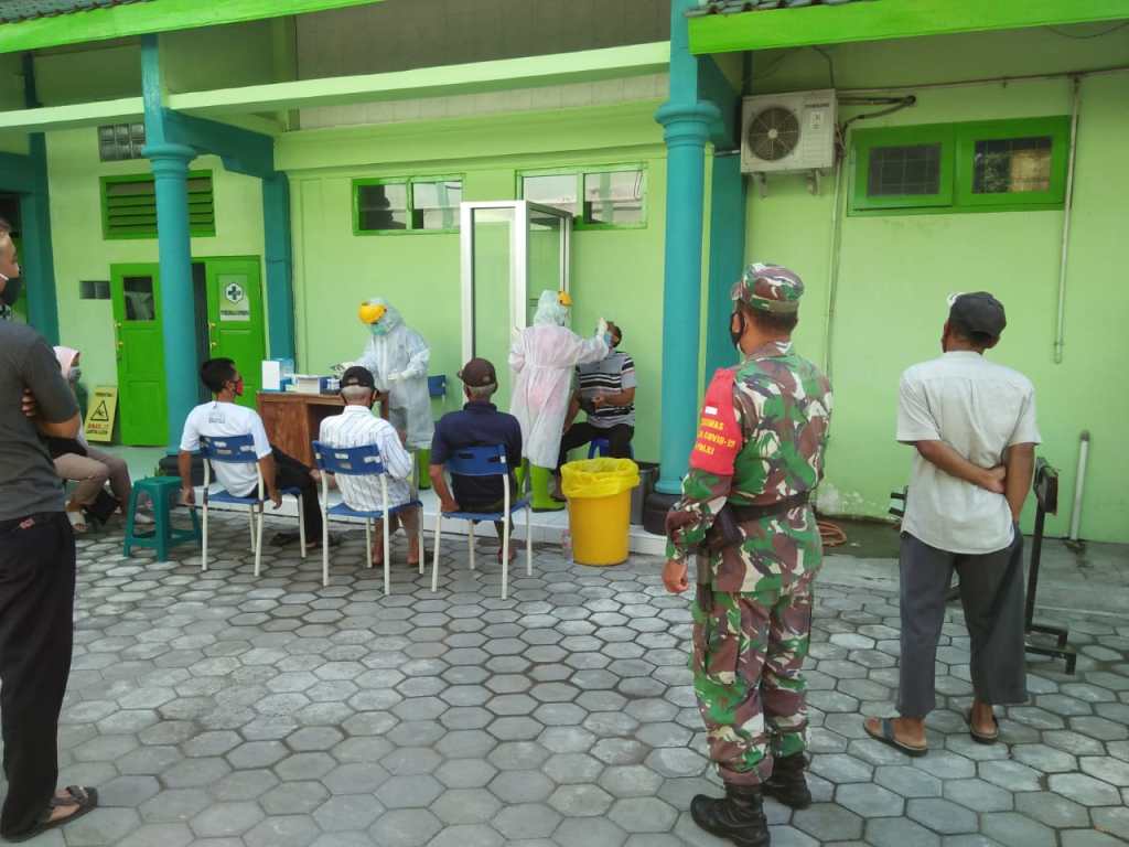 Klaten | Memaksimalkan upaya pencegahan Covid-19, Babinsa Desa Trasan Koramil 21/Juwiring Kodim 0723/Klaten Serma Lamiyo, melaksanakan kegiatan pendampingan Tim Kesehatan dari Puskesmas Juwiring dan Tim Gugus Tugas Covid-19 melaksanakan Swab Test terhadap warga di wilayah Desa Trasan, Kec. Juwiring. Kegiatan tersebut dilaksanakan di Puskesmas Juwiring, Kab. Klaten, Rabu (18/11/2020).