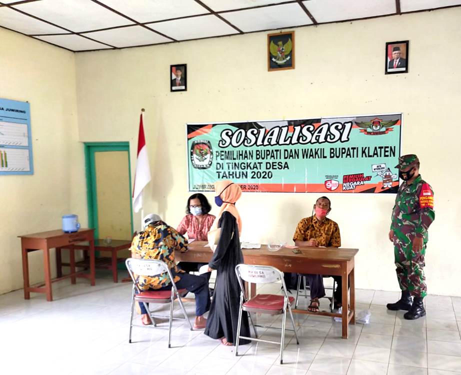 Klaten | Anggota Babinsa Koramil 21/Juwiring Kodim 0723/Klaten melaksanakan pengamanan penyaluran Bantuan Sosial Tunai (BST) Tahap VIII dari Kemensos RI kepada warga terdampak Covid-19 melalui PT. Pos Indonesia yang bertempat di Aula Kantor Desa Juwiring, Kecamatan Juwiring, Kabupaten Klaten, Jum’at (13/11/2020)
