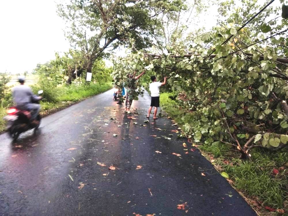 Klaten – Koramil 21/Juwiring Kodim 0723/Klaten bersama Perangkat Desa Juwiring bahu membahu membantu masyarakat membersihkan pohon tumbang akibat hujan lebat disertai angin kencang sehingga menutup akses jalan utama di Desa Juwiring, Kecamatan Juwiring, Kabupaten Klaten, Kamis (19/11/2020).