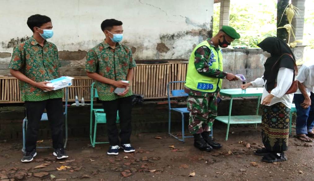 Klaten | Upaya pencegahan penyebaran Virus Corona di seluruh wilayah masih terus digencarkan, salah satunya yang ditempuh Babinsa Desa Bolopleret Koramil 21/Juwiring Kodim 0723/Klaten Serda Drajad Nurhadi bersama Perangkat Desa Bolopleret dan Gugus Tugas Penanggulangan Covid-19 Desa Bolopleret dengan memantau dan mengamankan kegiatan warga yang sedang menggelar resepsi pernikahan di RT 02 RW 06 Dk. Ngerni Ds. Bolopleret, Kecamatan Juwiring, Kab. Klaten, Senin (9/11/20).