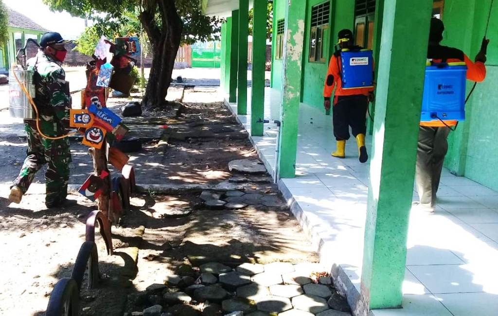 Klaten – Babinsa Desa Tanjung Koramil 21/Juwiring Kodim 0723/Klaten Serka M. Asfari bersama Relawan Kecamatan Juwiring dan komponen masyarakat Desa Tanjung melaksanakan penyemprotan disinfektan di wilayah Desa Tanjung, Kec Juwiring, Kab Klaten, Kamis (28/01/2021).