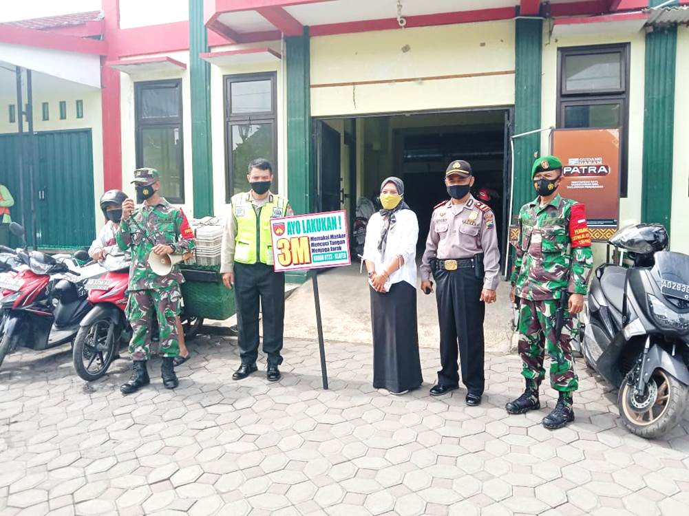Juwiring – Anggota Babinsa Jajaran Koramil 21/Juwiring Kodim 1723/Klaten terus melaksanakan kegiatan pengawasan kepatuhan dan disiplin warga terhadap penerapan protokol kesehatan Covid-19 di area pasar Tanjung, Desa Boloplerert, Kecamatan Juwiring, Kab. Klaten, Sabtu (6/2/21).