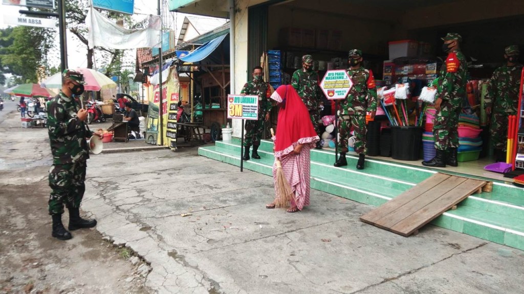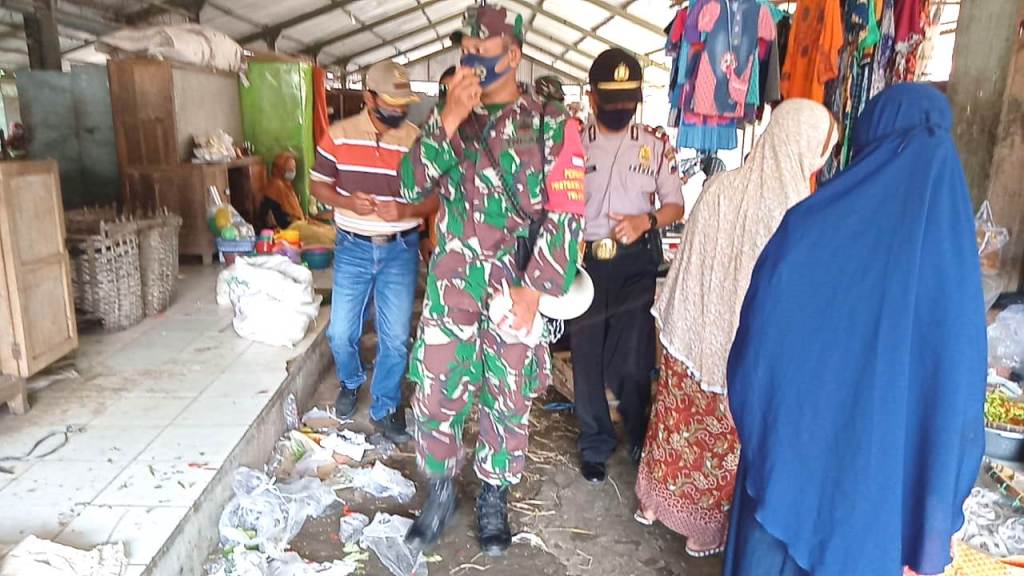 Klaten – Koramil 21/Juwiring Kodim 0723 Klaten bersama Gugas Penanggulangan Covid-19 Kecamatan Juwiring, gencar melaksanakan operasi penegakan protokol kesehatan selama Pemberlakuan Pembatasan Kegiatan Masyarakat (PPKM) berskala Mikro di pasar-pasar dan pertokoan wilayah Kecamatan Juwiring, Kab. Klaten, Selasa (2/3/2021).