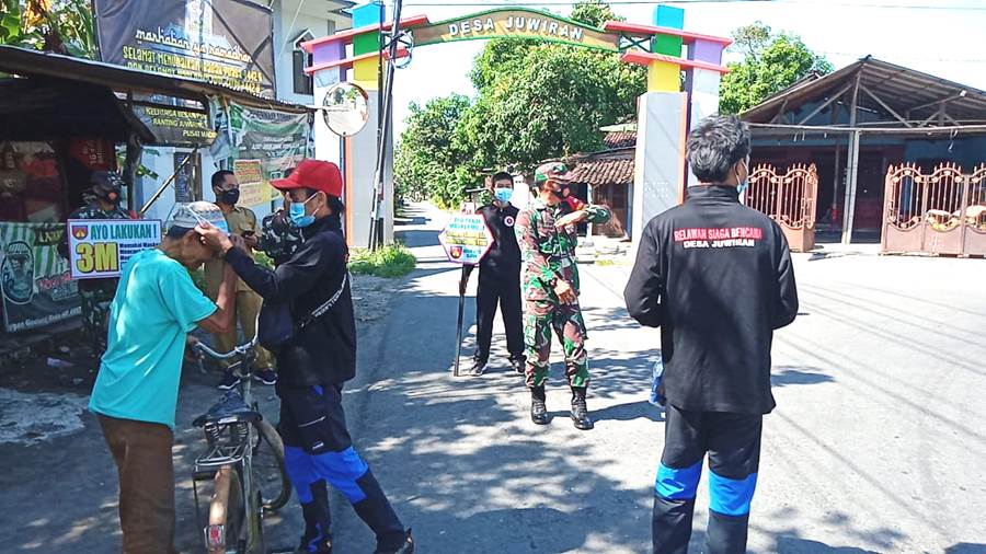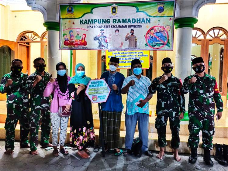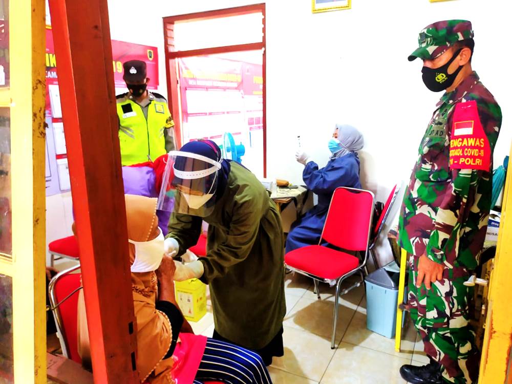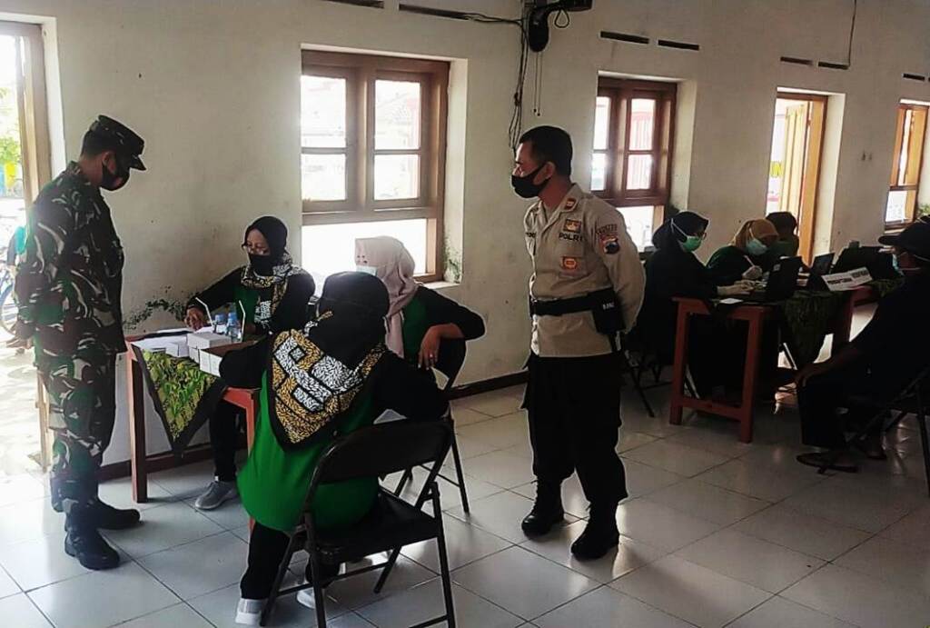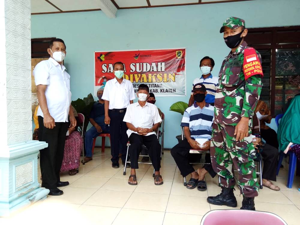 Klaten – Babinsa desa Bolopleret Koramil 21/Juwiring Kodim 0723/Klaten Serda Drajad Nurhadi memonitor dan mendampingi kegiatan vaksinasi Covid-19 Tahap II bagi lansia warga Desa Bolopleret di Kantor Desa Bolopleret, Kecamatan Juwiring, Kab. Klaten. (14/4/2021).