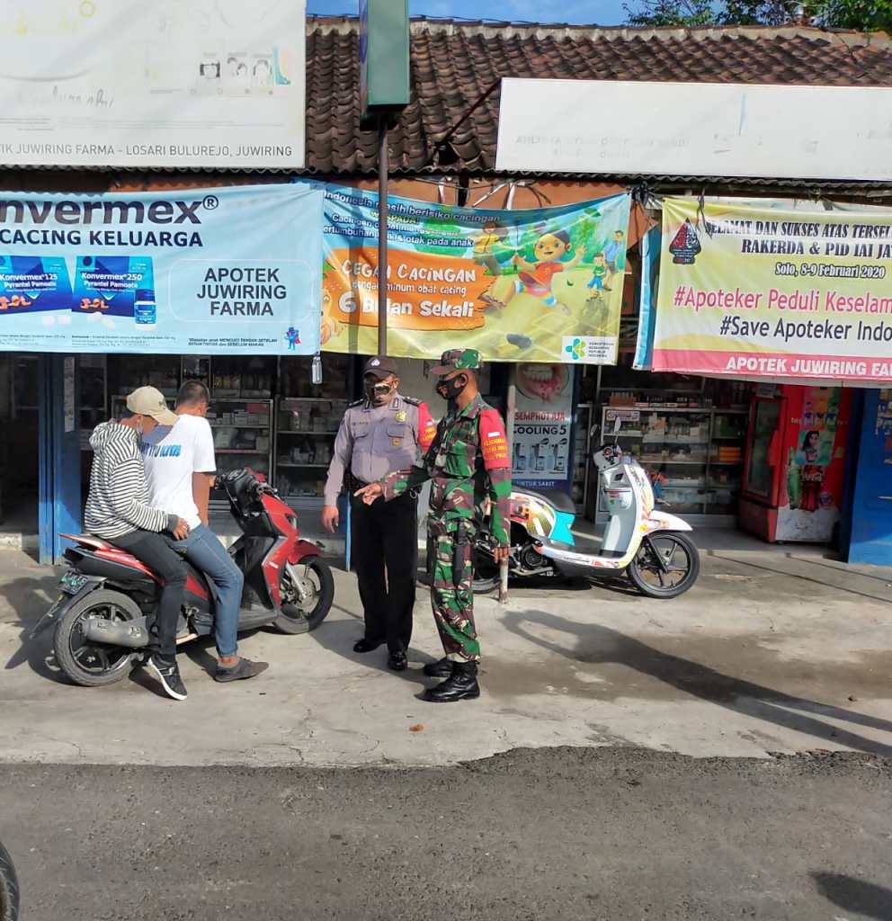 Dalam kegiatan tersebut, dilakukan teguran sekaligus peringatan bagi masyarakat yang tidak menggunakan masker di depan pasar Juwiring Kec. Juwiring dalam rangka menuju kawasan tertib protokol kesehatan (New Normal) di Kecamatan Juwiring.