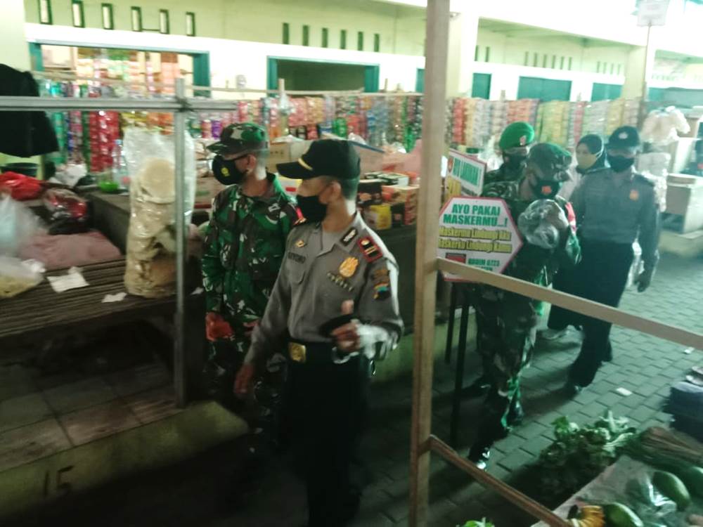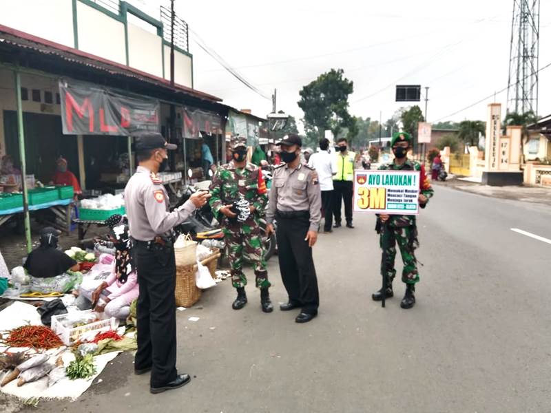 Klaten – Koramil 21/Juwiring Kodim 0723 Klaten bersama Muspika Juwiring dan Gugas Penanggulangan Covid-19, mengintensifkan Operasi penegakan protokol kesehatan selama Pemberlakuan Pembatasan Kegiatan Masyarakat (PPKM) Mikro di Area Pasar Tanjung, desa Bolopleret, Kecamatan Juwiring, Kab. Klaten, Senin (22/2/2021).